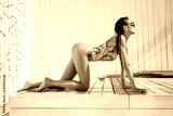 Side view of sexy slim brunette girl in one-piece swimsuit and sunglasses with cocktail sexually posing over wood background on beach