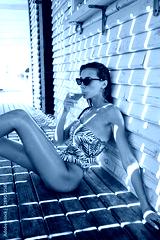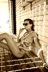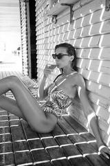 Attractive brunette girl in one-piece swimsuit and sunglasses resting with cocktail over wood background on beach