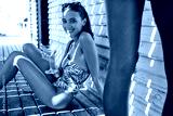 Cheerful stylish brunette girl in one-piece swimsuit happily looking in camera while resting with cocktail over wood background on beach