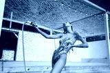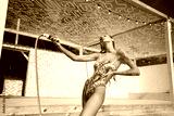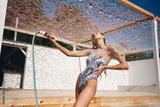 Beautiful sexy slim brunette girl in one-piece swimsuit sensually using hose to cool down on beach on a hot day