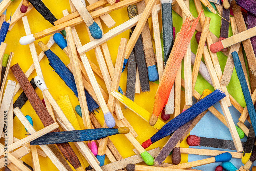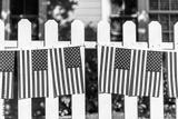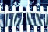 Patriotic American flags hanging decorations on white picket fence in Aspen, Colorado near Independence Day July 4th celebration