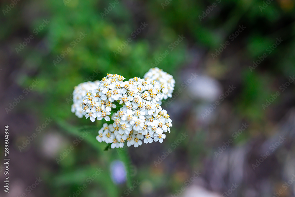White yarrow wildflowers macro closeup in forest on Snowmass Lake hike trail in Colorado in National Forest park mountains