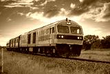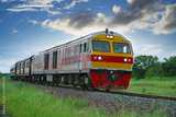 Locomotive train runs on the tracks among the green meadow on both sides during evening.