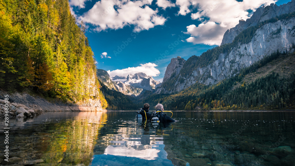 2 Taucher am Gossausee mit Blick auf den Dachstein / Two Diver at Gossau lake