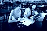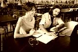 Two young cheerful students happily making notes while studying together in library of university