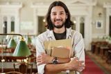 Portrait of young cheerful male student with notepads joyfully looking in camera in library of university