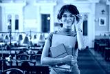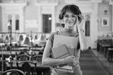 Portrait of beautiful smiling female student in eyeglasses with notepads happily looking in camera in library of university