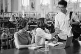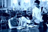 Group of young casual students happily greeting each other while studying in library of university