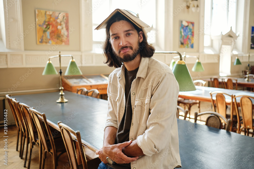 Portrait of young casual male student thoughtfully looking in camera while fooling around with book on head in library of university