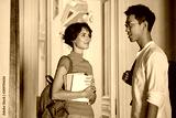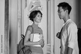 Two young attractive international students with backpacks happily talking while standing in corridor of university