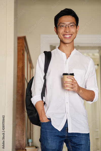 Young attractive asian male student in eyeglasses with backpack and coffee to go joyfully looking in camera in university