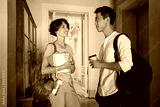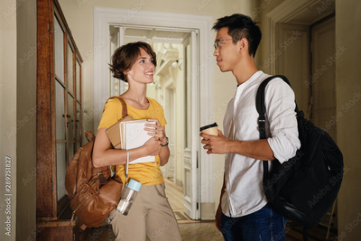 Two young attractive casual international students with backpacks and notepad happily talking in corridor of university