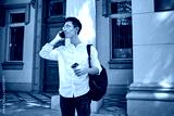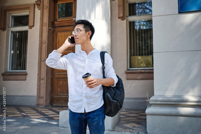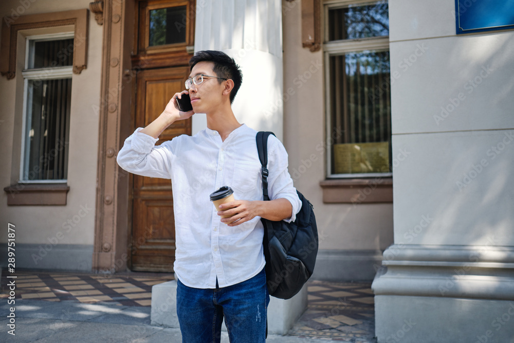 Young asian male student in eyeglasses with backpack thoughtfully talking on cellphone on street near university