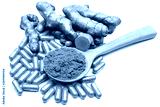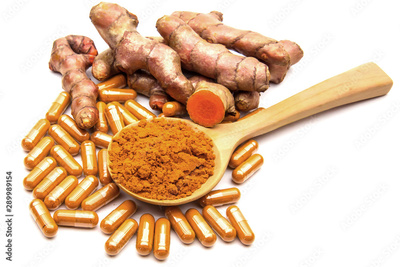 Turmeric or Curcuma longa Fresh turmeric herb and Herbal Capsule isolated on white background.