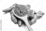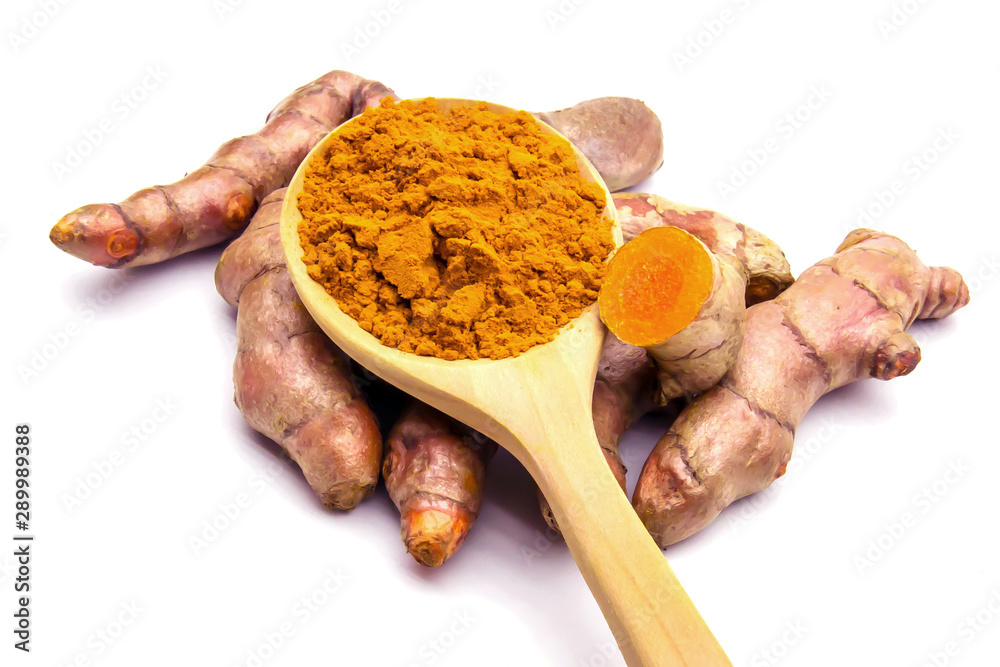 Fresh turmeric and power on white background.