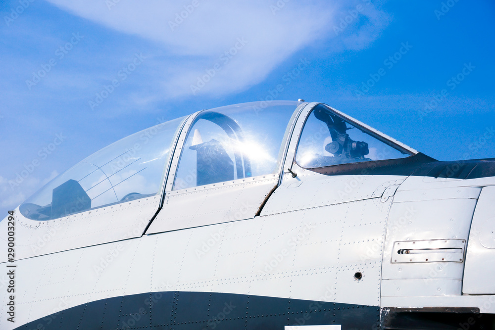 Closeup of military fighter jet cockpit and canopy against a blue sky,aircraft canopy against