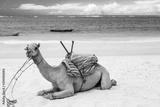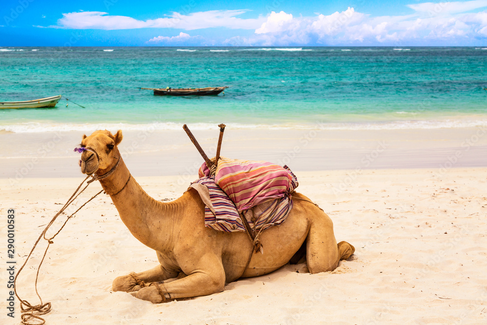 Camel at African sandy Diani beach, Indian ocean in Kenya, African landscape.