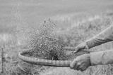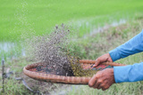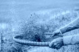 Hands of rural farmers using bamboo threshing basket are winnowing mung beans.