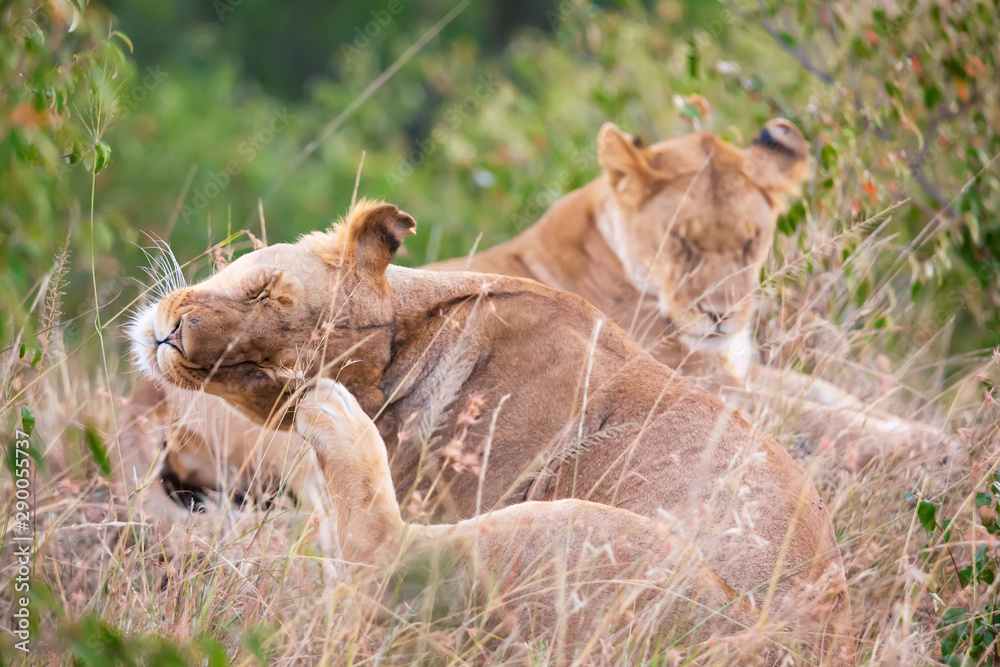 Female lioness scratching in Masai Mara National Park. Safari in Kenya.