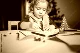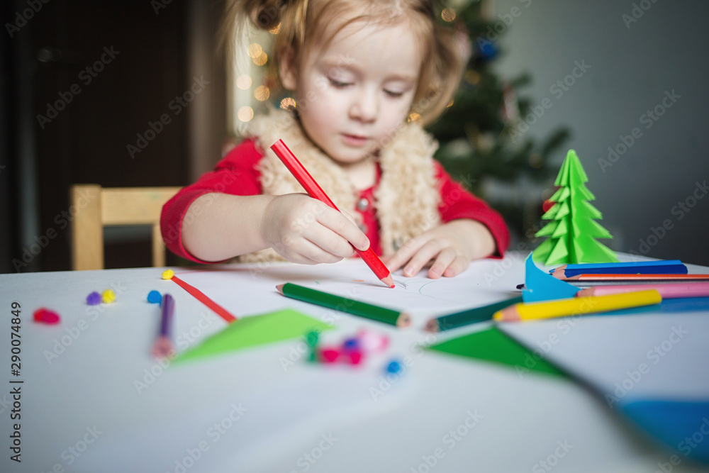 the child writes a letter to Santa Claus. a little girl draws with crayons on the background of the Christmas tree. the concept of new year kids creativity