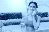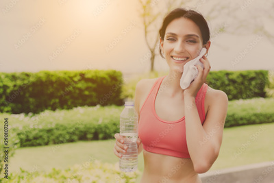 Charming sport woman hold bottle of drinking water, use towel wipe sweat after jogging. Attractive beautiful girl taking a rest before running again. She always drink water often when hot weather