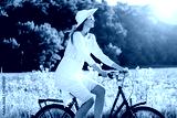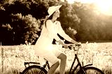 Pretty young woman in white dress and sunglasses enjoying her rural bike trip
