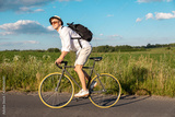 Casual lad in white riding a stylish yellow bike in summer countryside