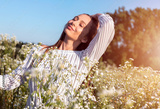 Cheerful brown-haired young woman enjoys feeling unity with nature on flowery field