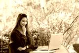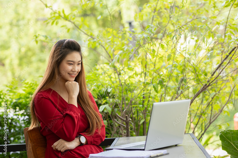 Business Asian young woman wearing red dress working with computer laptop and thinking to get ideas and requirement in Business startup feeling so happiness,Small Business Startup Concept