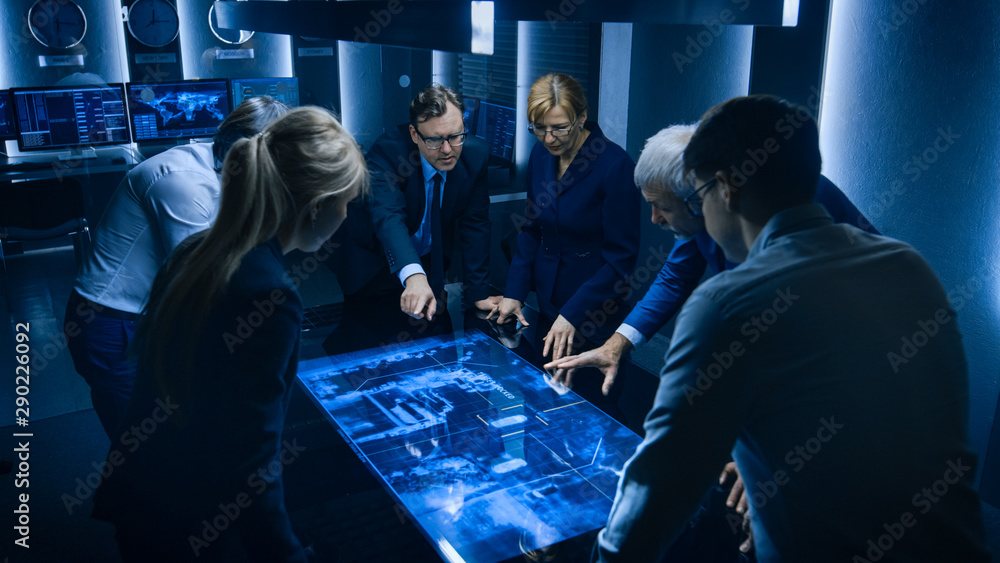 Team of Government Intelligence / FBI Agents Standing Around Digital Touch Screen Table and Tracking Suspect Vehicle Using Satellite Surveillance in the Monitoring Room.