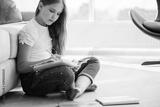 Serious school girl sit on floor write in notebook