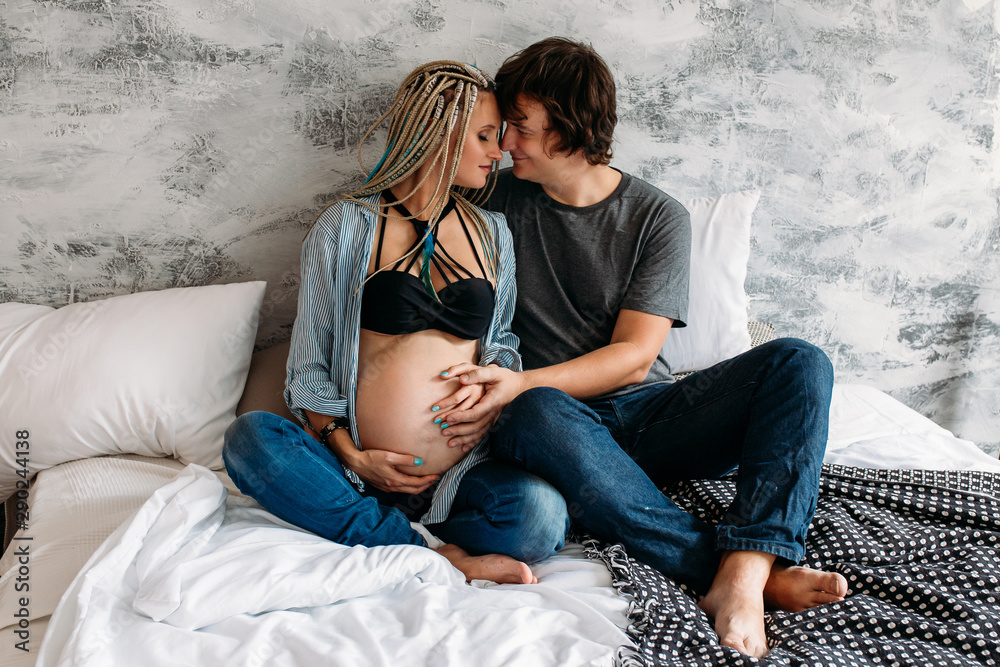 Happy man touching belly of smiling pregnant woman lying on bed at home