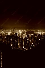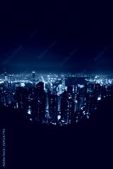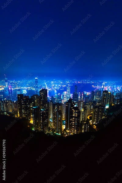 The most famous view of Hong Kong at twilight sunset. Hong Kong skyscrapers skyline cityscape view from Victoria Peak illuminated in the evening. Hong Kong, special administrative region in China.