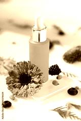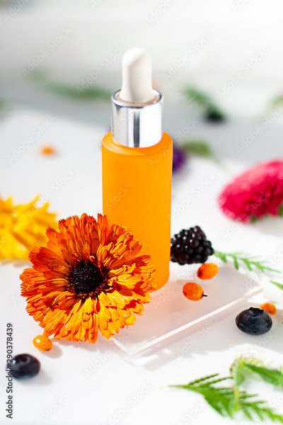 Cosmetic glass bottle with organic calendula and berries extracts or oils in the water background. Hydrating serum with antioxidants, vitamin C or peeling acids concept close up