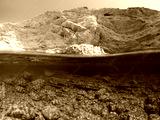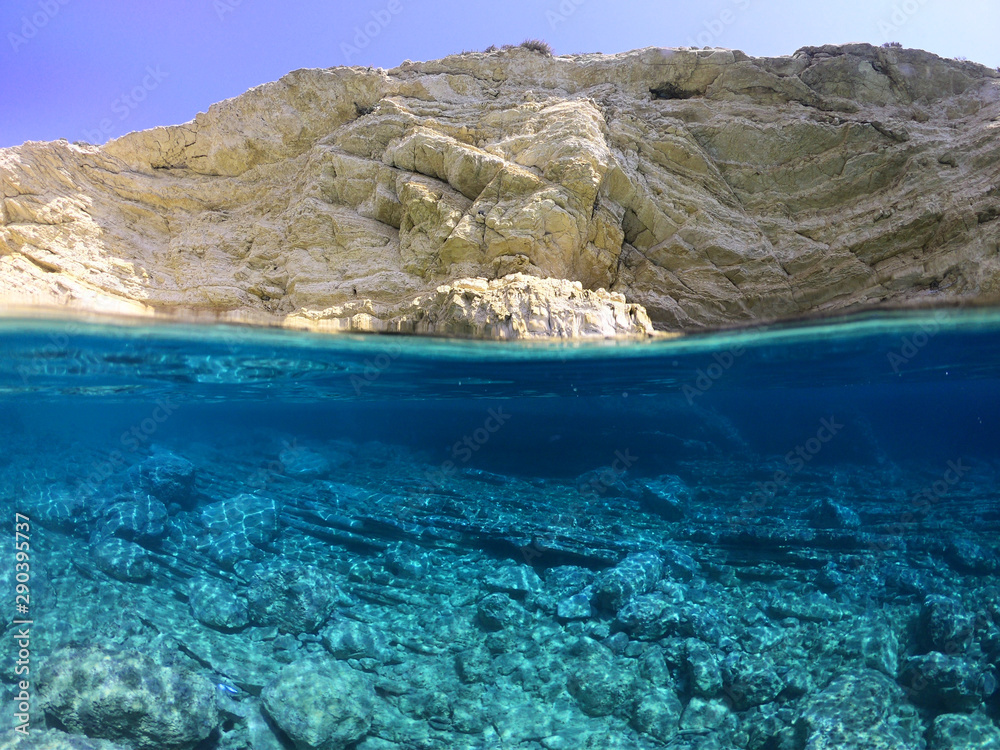 Above and below underwater photo of crystal clear sea paradise rocky seascape of Laki beach in Kato Koufonisi island, Cyclades, Greece