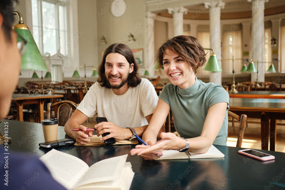 Young smiling casual students joyfully discussing project together in library of university
