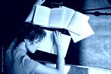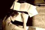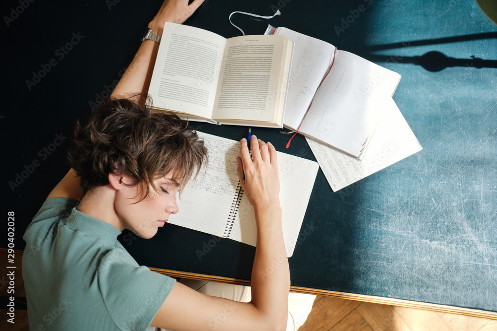 Top view of young exhausted female student tiredly sleeping on desk with books and abstract while study in library of university
