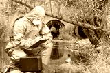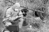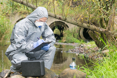 a man in a protective suit records research on environmental pollution after a man-made disaster