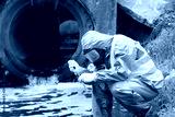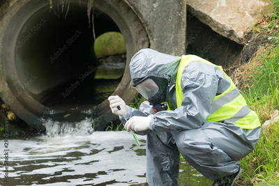 a man in a protective suit takes a sample of water from the river after the release of chemical waste
