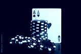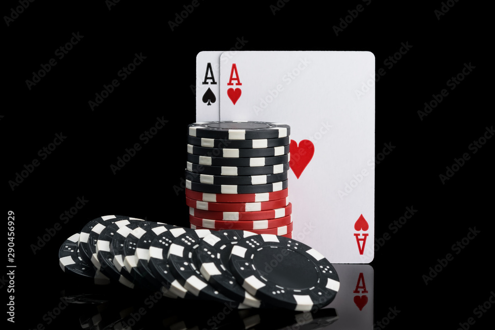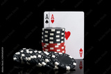 two cards and black and red poker chips on a black background