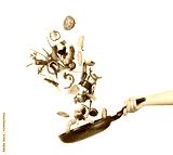 Cooking concept. Vegetables are flying out of the pan isolated on white background. Healthy food.