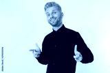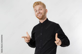 Close up of young guy with redhead and red beard isolated on white background. Stylish man in black shirt pointing copy space. Successful and happy male. Super happy and exciting person.