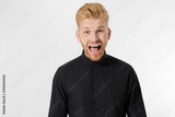 Excited surprised shock young shouting man isolated on gray background. Happy Redhead guy with red beard in black stylish shirt. Success and pass exam concept. Copy space. Close up of Face expression.
