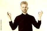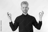 Practice meditation for business success concept. Young man Master stress and prime for success, overcome anxiety. Close up of redheaded guy in meditate position isolated on white. Calm, clear mind