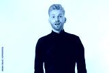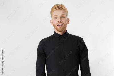 Excited surprised shock young shouting man isolated on gray background. Happy Redhead guy with red beard in black stylish shirt. Success and pass exam concept. Copy space. Close up of Face expression.