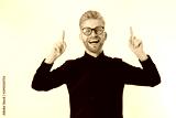Happy Stylish guy in black shirt and glasses pointing copy space. Successful young man Entrepreneur concept. Redheaded man with red beard. Start up, young founder concept isolate on white background