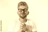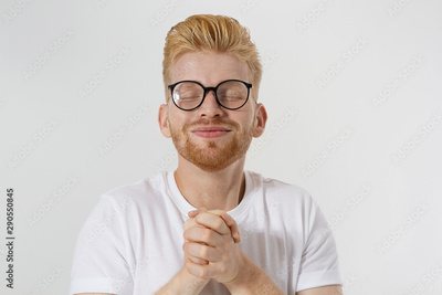 Praying young man isolated on white background. Copy space. Make a wish and fortune concept. Redheaded guy with red beard and glasses in white t shirt wanna dreams come true. Success and good luck.