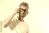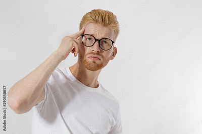 Young man in thinking process. Close up redheaded guy with red beard in white t shirt, glasses focus on creating startup idea isolated on gray background. Intellect mind and brain power. Mental health