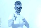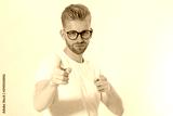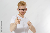 Guy pointing on you by fingers isolated on white background. Young stylish redheaded man, red beard and glasses. White t shirt shows on you. Success and confidence concept. Copy space. Selective focus