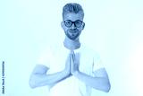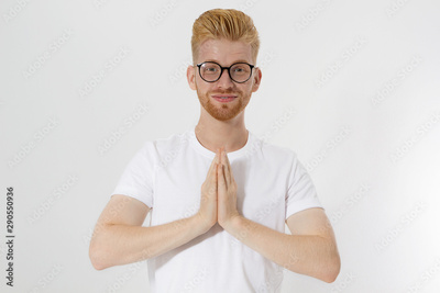 Practice meditation for business success concept. Young man Master stress and prime for success, overcome anxiety. Close up of redheaded guy in meditate position isolated on white. Calm, clear mind